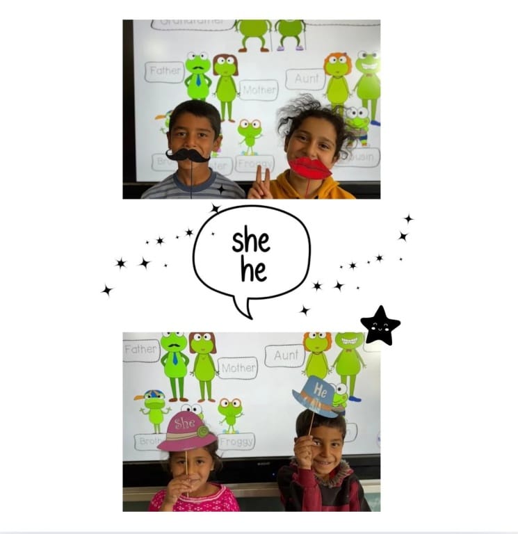 3. Sınıf öğrencilerimizle İngilizce dersi “Family” ünitesinde he/she zamirlerini ayırt edebilmek ve öğrenmeyi kalıcı hale getirebilmek için eğlenceli maskeleri kullandık. Öğretmenimiz aile üyelerinden birini söylerken öğrencilerimiz erkekse mavi şapkayı ve bıyık maskesini, kızsa pembe şapkayı ve dudak maskesini kullandı.